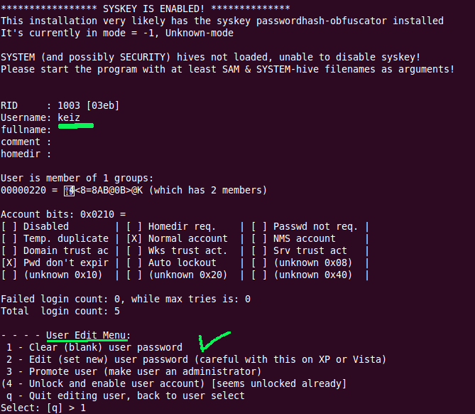 Выберем первый пункт «1» Clear user password, т. е. Пользователь будет с пустым паролем.