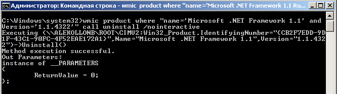 wmic product where «name=’Microsoft .NET Framework 1.1′ and Version=’1.1.4322′» call uninstall /nointeractive