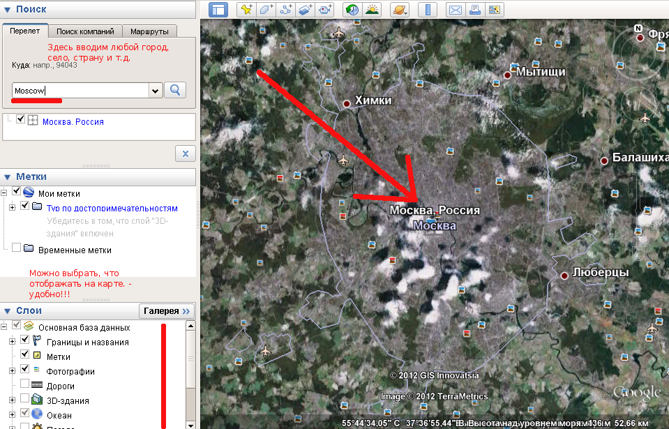 К примеру найдем мой любимый город — Москва. Согласно скриншоту ниже в поле Куда набираем — Москва. Справа отобразится результат. Меню очень понятное. Рассмотрение как и что делать оставляю на Вас.